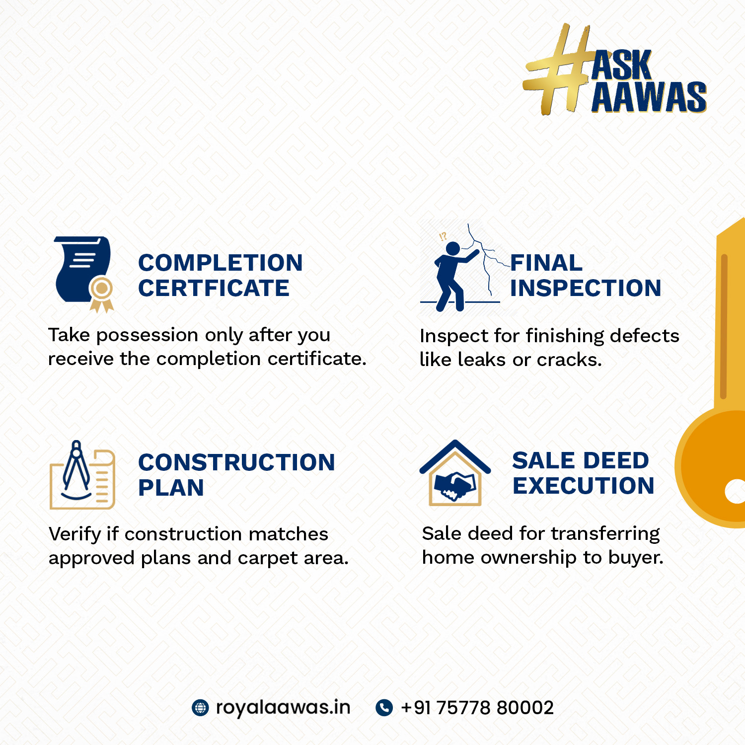 Ensure you receive the completion certificate before taking possession. This confirms that the building complies with legal and safety standards.